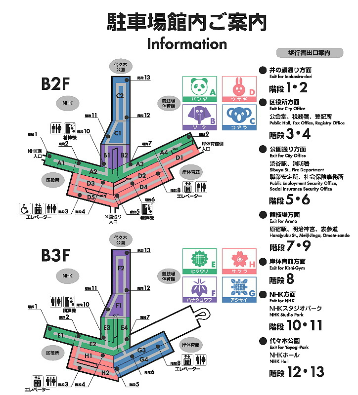 NHKホール、岸体育館、ライブハウスAX、C.C.Lemonホール前に出入口がある地下駐車場がございます。渋谷区役所前公共地下駐車場のD4、D2、G3、G4エリアに駐車し、8番階段エレベーターで地上階まで出まして右手のピン ク色のビル8階になります。駐車場内地図